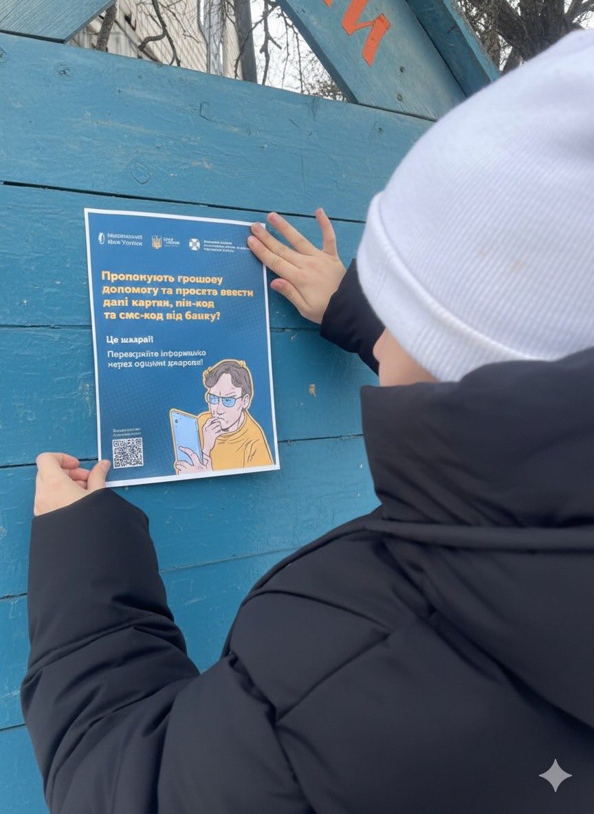 У межах конкурсу наші вихованці вже розпочали активну інформаційну кампанію. Одним із ключових етапів стало розповсюдження та розміщення тематичних плакатів у громадських місцях. Ці матеріали містять чіткі інструкції з платіжної безпеки, які допоможуть кожному мешканцю захистити свої цифрові гаманці 📲.